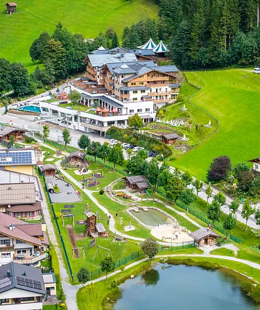 Am Spielplatz gibt es gleich drei liebevoll gestaltete Almhütten: die Heidi-Alm, die Hoamalm und die Hoch-Alm. Jede dieser kleinen Almen lädt Kinder zum Entdecken ein. In der Nähe der Hütten leben Ziegen, Hasen und Seidenhühner im Goaß-Stall – Streicheln und Füttern ist erlaubt!