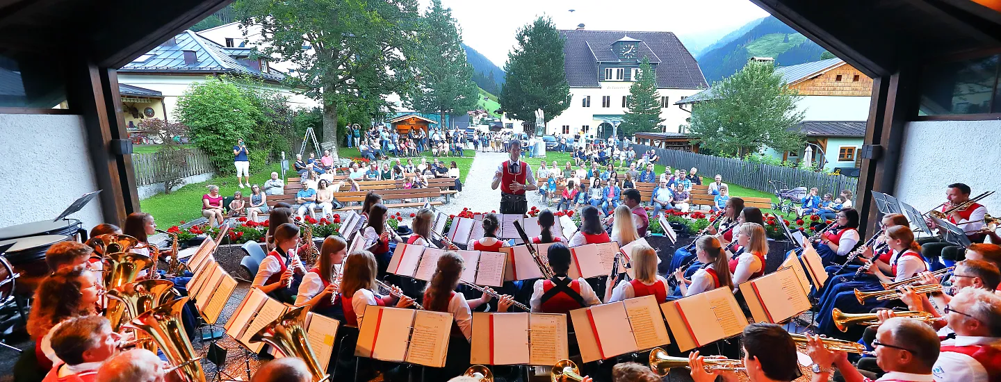 Sit down, listen and enjoy: every week there is a concert at the music pavilion in Grossarl. Look forward to traditional music from the Grossarl traditional music band and various guest bands from neighbouring villages. Admission is free and there is a small drinks bar. On some evenings there is a special highlight: a performance by the Grossarltal folk dance and Schuhplattler group.
